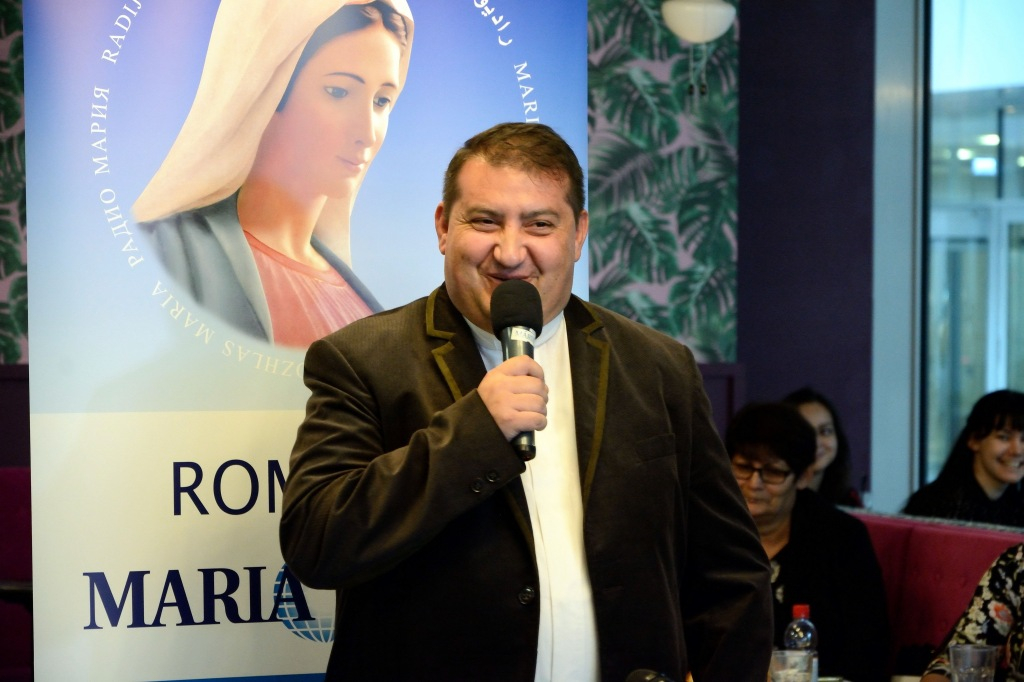 Karácson Tibor, az Erdélyi Mária Rádió műsorigazgatója, maga is cigány származású pap köszöntőjében elmondta, hogy Csíkszeredából származik, tizenöt esztendeje pap, négy éve a rádió műsorigazgatója. Kiemelte, hogy mint minden Mária Rádió, úgy a most induló, cigány embereknek szóló is a Szűzanya ajándéka, mely égi kegyelem. Elmondta, hogy a Romano Maria Radióban elhangzó napi szentmiséket Erdélyből, a nagyváradi stúdióból sugározzák majd el. Szólt arról is, hogy a mindennapi katekézist, szentírás magyarázatokat ő fogja mondani. Végül kiemelte: reméli, hogy munkája a megtérést fogja hirdetni a cigányság részére.