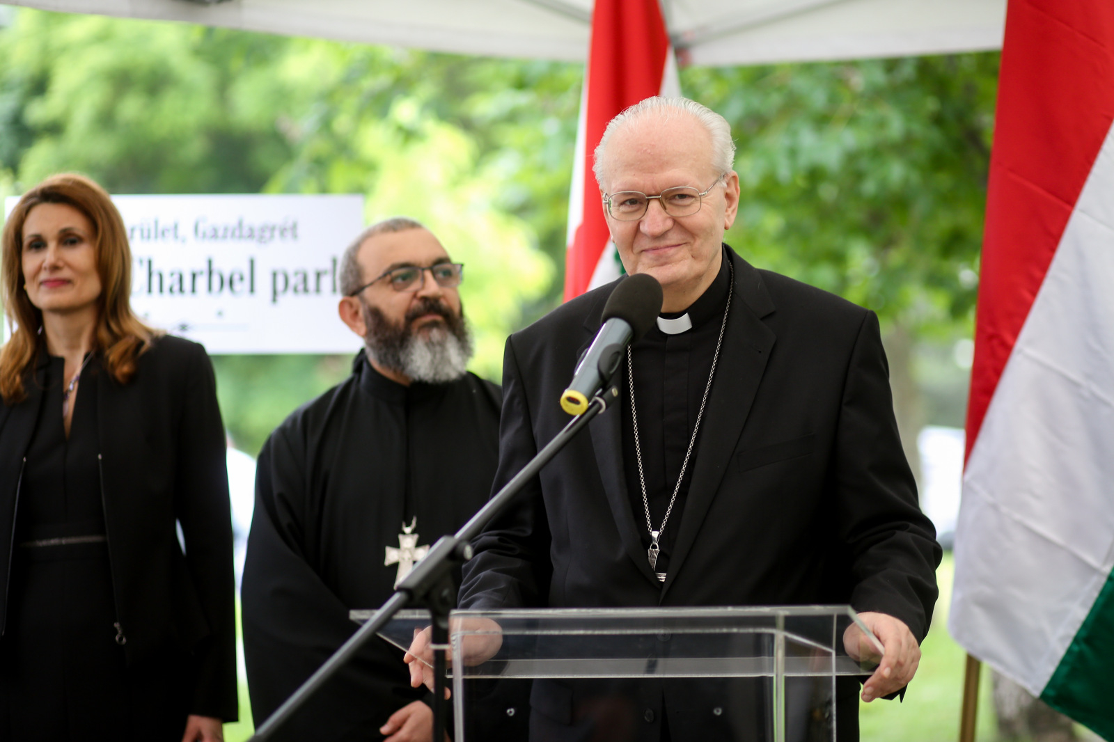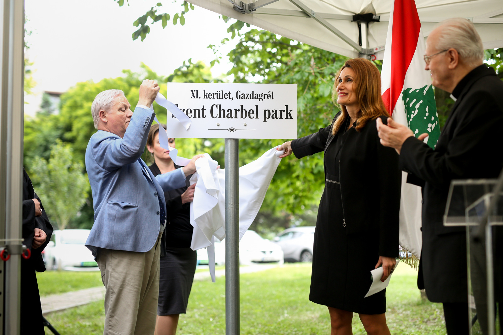 Erdő Péter bíboros – mielőtt Tarlós Istvánnal és Joanna Azzi nagykövettel ünnepélyesen leleplezte a Szent Charbel park utcanévtábláját és megáldotta a teret – hangsúlyozta, hogy nagy örömmel hozta haza a szent ereklyéit, melyeket Libanonban kapott.