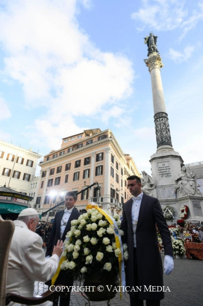 A Szentatya december 8-án délután, a Boldogságos Szűz Mária szeplőtelen fogantatásának ünnepén először a Santa Maria Maggiore-bazilikába, majd a Piazza di Spagna térre ment imádkozni. Az alábbiakban a téren elmondott imájának fordítását tesszük közzé.