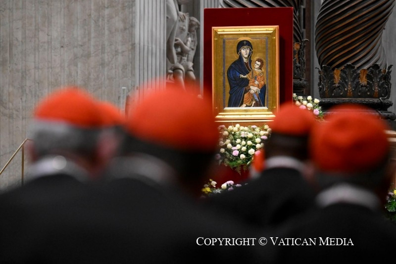 Ezért, Isten Anyja és a mi Anyánk, hozzád jövünk, és szeplőtlen Szívedben keresünk menedéket. Irgalomért esedezünk, irgalmasság Anyja; békéért, béke Királynője! Rázd fel a gyűlölet csapdájába esettek lelkét, térítsd meg azokat, akik konfliktusokat táplálnak és szítanak! Szárítsd fel a gyermekek könnyeit – sokat sírnak ebben az órában –, állj a magányosak és idősek mellé, támogasd a sebesülteket és a betegeket, oltalmazd azokat, akiknek el kellett hagyniuk hazájukat és szeretteiket, vigasztald a csüggedőket, ébreszd fel reményt!