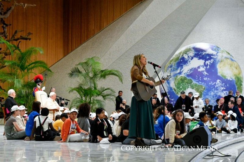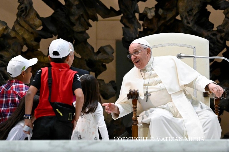 És valóban, a világ minden tájáról jöttetek ide, mint sok testvér, akik egy nagy házban találkoznak. Ez az a nagy ház, amelyet Jézus adott nekünk: az Egyház családi ház, és az Úr mindig öleléssel és simogatással fogad bennünket. Mindannyiatokat így szeretnélek üdvözölni, egyesével, de olyan sokan vagytok… ezért együtt mondom mindannyiatoknak, fiúk és lányok, hogy csodálatos teremtmények vagytok, csodálatos életkorban vagytok, és azt mondom nektek, hogy bátran menjetek előre. És az Egyházban vagytok. Gondoljunk azokra a gyermekekre, akik most szenvednek – ne feledjük – az éghajlatváltozás miatti természeti csapásoktól, az éhségtől, a háborútól, a szegénységtől. Ugye tudjátok, hogy vannak rossz emberek, akik kárt okoznak, akik háborút indítanak, akik pusztítanak? Ti is rosszat akartok tenni? [Válaszolják: Nem!] Ti segíteni akartok? [Válaszolják: Igen!] Ennek örülök!