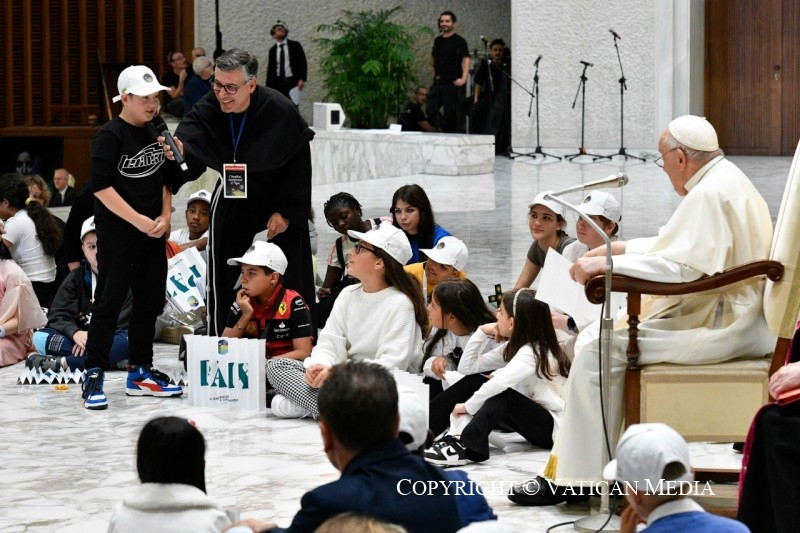 A Szentatya november 6-án délután több mint hétezer gyermekkel találkozott a vatikáni VI. Pál teremben. A gyermekek a világ nyolcvannégy országából érkeztek. A terembe érkezésekor öt – egy-egy szíriai, ukrán, benini, guatemalai és ausztráliai – gyermek köszöntötte énekével a pápát. Összesen tizennégyen tettek fel néhány kérdést a Szentatyának. Az alábbiakban teljes terjedelmében közöljük a beszélgetés fordítását.