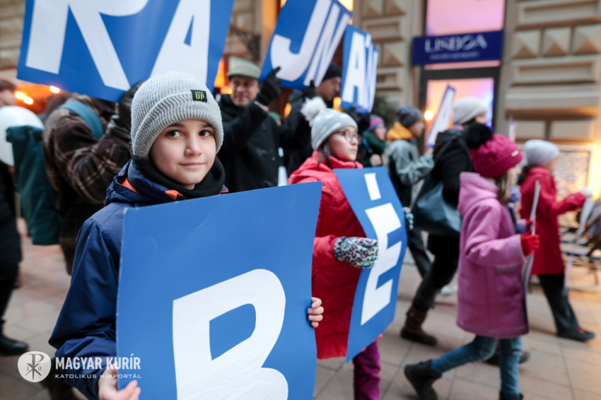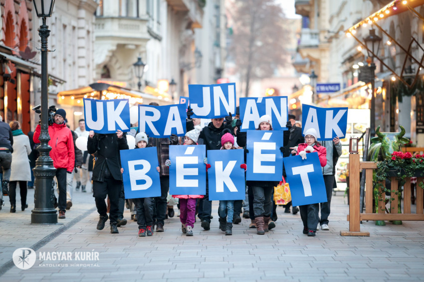 Végül Mihályi Anikó elmondta József Attila Tél című versét, mert – mint elhangzott – a költészet átvezet bennünket a prófécia, az imádság világába. A menet ezután fehér lufikkal, a békét több nyelven hirdető feliratokkal, csendben elindult az Egyetemi templom felé, ahol Székely János szombathelyi megyéspüspök, a Magyar Katolikus Püspöki Konferencia Caritas in Veritate Bizottságának elnöke vezetésével ökumenikus imádságot tartottak Ukrajna és az egész világ békéjéért.
