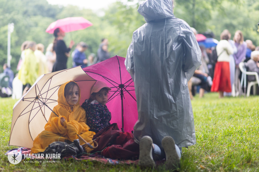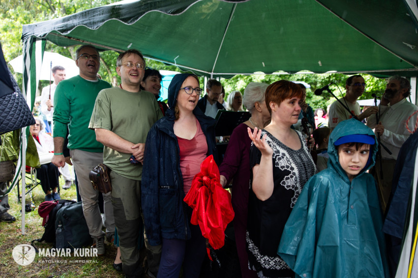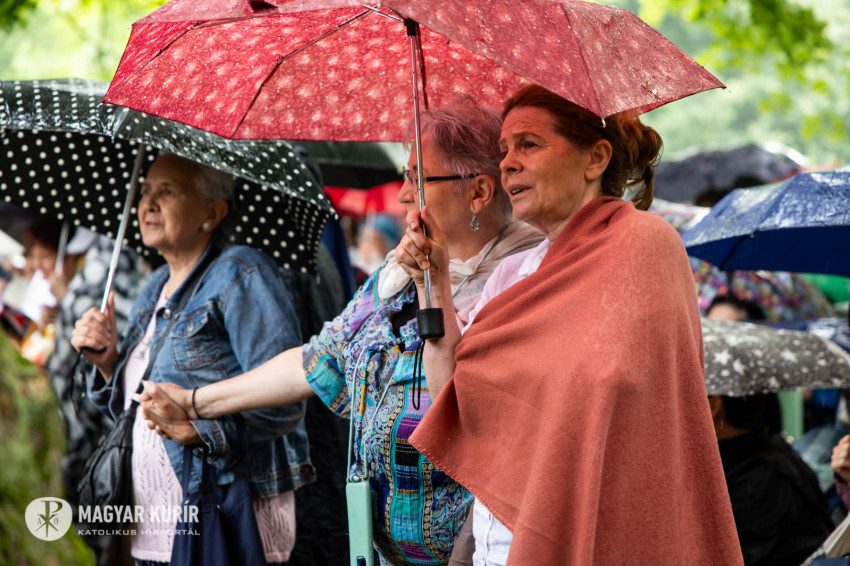 A lélekáradásért fohászkodó dicsőítés alatt még ragyogóan sütött a nap, bár az égen helyenként foltokban már gyülekezni kezdtek az esőfelhők. A szertartás kezdetére az égen már csak a felhők látszottak, szinte esti sötétség borult a kápolna előtti rétre. Az égből lezúduló eső ereje Noé özönvízét idézte, és csak a szentmise áldozati részénél állt el. Az esernyők kinyíltak, előkerültek az esőkabátok, a mintegy négy-ötszáz hívő hűségesen kitartott, csakúgy mint a dicsőítő zenei szolgálatot végző Emmánuel Közösség zenekara.