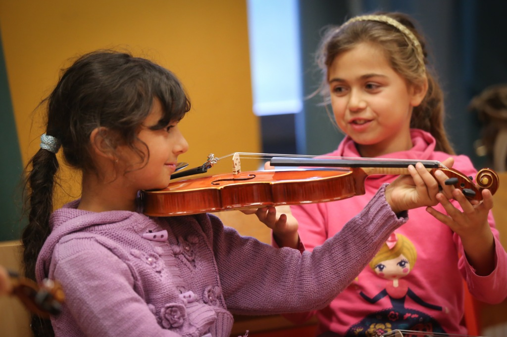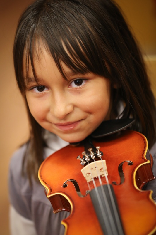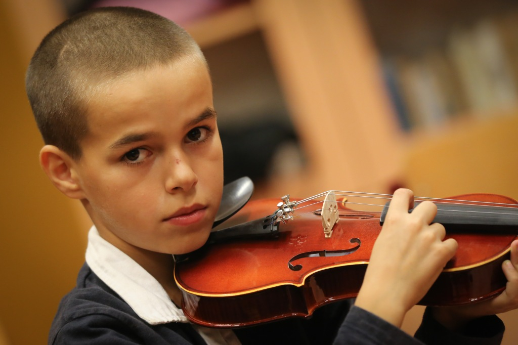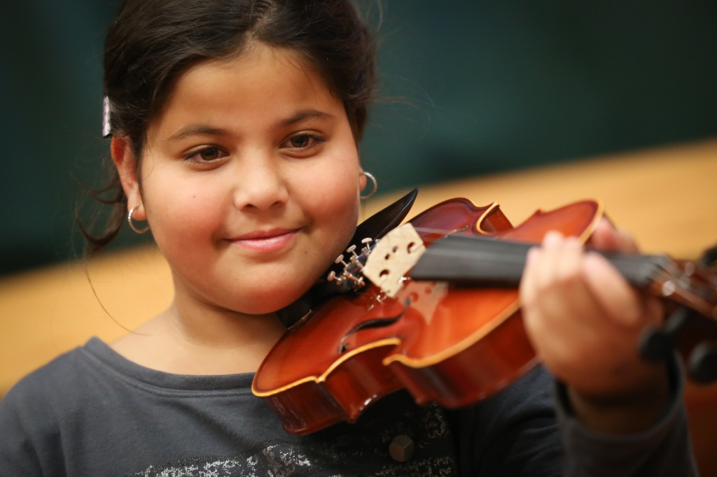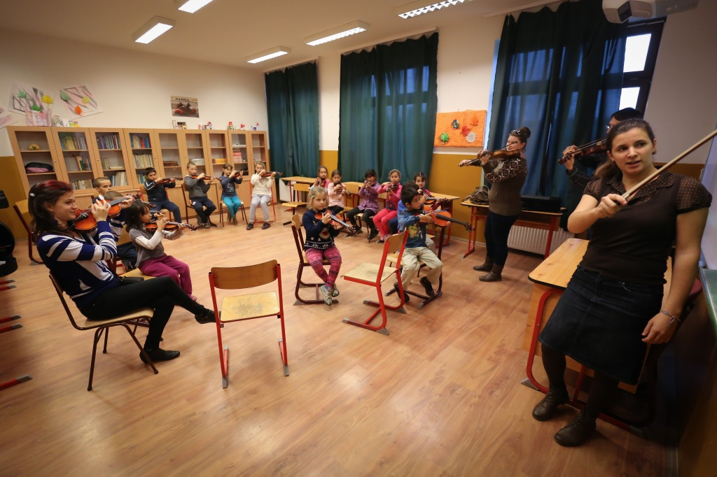 Először csak énekeltek, ritmusgyakorlatokat végeztek, játszottak. A foglalkozáson, amelyen részt veszünk, egy egyszerű dallamot pengetnek hegedűn, próbálgatják sokszor egymás után, mindig választanak hozzá maguk közül egy kis karmestert, aki a táblánál diktálja az ütemet. A dallamot a tanárok játsszák, a gyerekek ezt kísérik. Fegyelmezetten, jó hangulatban, türelmesen, egymásra figyelve. Kitti úgy látja: a zenével fegyelmet lehet tanulni, és összhangot tud teremteni az ember lelkivilágában. Nemcsak a hangok szépségét, hanem más értékeket is nyújt a gyerekeknek. Zsuzsi megerősíti, mennyire fontos számukra az egymásra figyelés. Nagyon hamar ráéreznek annak az örömére, hogy együtt játszanak, közösen hoznak létre valamit. Mindkét tanárnő számára nagy élmény és örömteli meglepetés, mekkora szeretetet kapnak a gyerekektől. Ez őket is gazdagítja, energiával tölti fel. Ha nem mondanák, akkor is látni: sugárzik róluk.