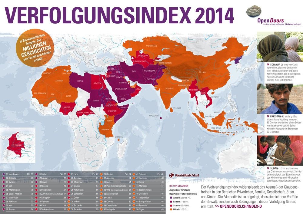 Az Open Doors minden évben összeállít egy ötven országot tartalmazó listát, hogy felhívja a világ figyelmét azokra a területekre, ahol a Krisztus-hívők különösen nehéz helyzetben vannak. A ranglistát vezető Észak-Koreát Szomália, Irak, Szíria, Afganisztán, Szudán, Irán, Pakisztán, Eritrea és Nigéria követi.