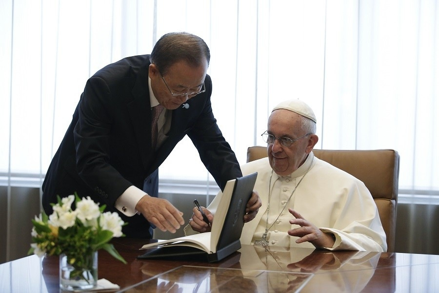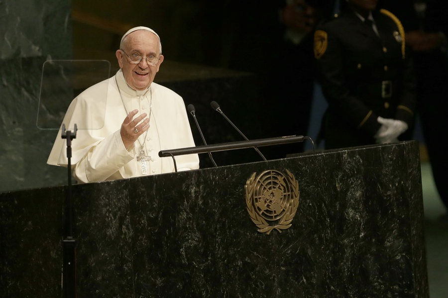Az ENSZ főtitkára – a hagyományt követve, mellyel megtisztelve érzem magam – most ismét meghívta a pápát, hogy beszédet mondjon a nemzetek e nagybecsű gyűlése előtt. Ban Ki Mun úr, a saját nevemben és az egész katolikus közösség nevében szeretném kifejezni önnek legőszintébb és legszívélyesebb megbecsülésemet! Köszönöm hozzám intézett kedves szavait is! Köszöntöm továbbá a megjelent államfőket és kormányfőket, a nagyköveteket, a diplomatákat, a köztisztviselőket és az őket kísérő technikai munkatársakat, az ENSZ mostani, hetvenedik közgyűlésének személyzetét, az ENSZ családja minden programjának és ügynökségének személyzetét, továbbá mindazokat, akik valamilyen címen részt vesznek ezen a gyűlésen. Rajtatok keresztül köszöntöm az ezen az összejövetelen képviselt valamennyi nemzet polgárait. Köszönöm mindenkinek az emberiség java érdekében kifejtett erőfeszítését.