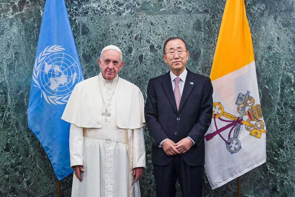 Ferenc pápa szeptember 25-én reggel kereste fel az ENSZ New York-i székházát, ahol a szervezet főtitkára, Ban Ki Mun fogadta. A Szentatya beszédet intézett az ENSZ személyzetéhez, majd magához a közgyűléshez szólt.