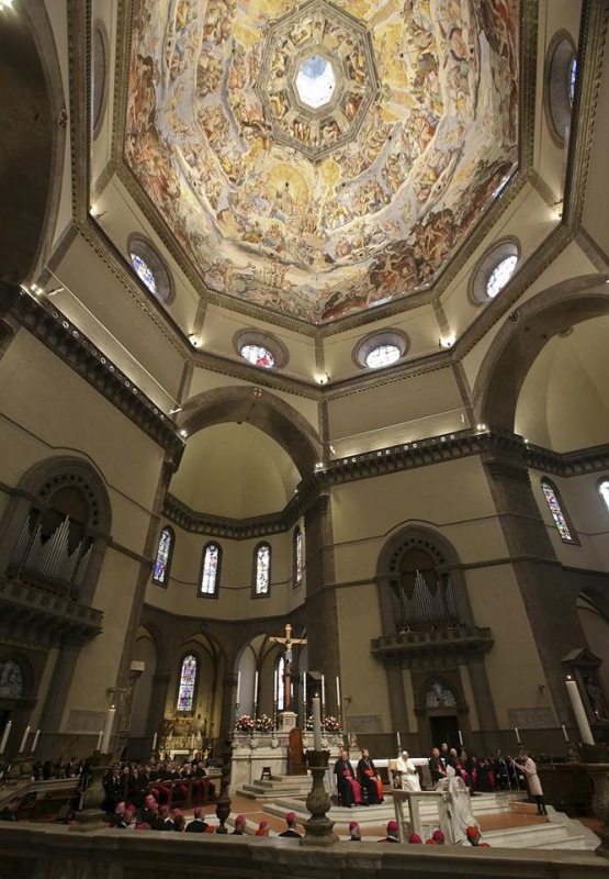 De az egyháznak világos választ kell tudnia adni a politikai vitákban felmerülő fenyegető kérdésekre is: ez az egyik formája annak a sajátos segítésnek, amellyel a hívők hozzá tudnak járulni a közös társadalom építéséhez. A hívők állampolgárok. És ezt itt, Firenzében mondom, ahol a művészet, a hit és az állampolgárság mindig dinamikus egyensúlyban állt egymással feljelentés és javaslat között. A nemzet nem egy múzeum, hanem egy folyamatosan épülő kollektív mű, ahol éppen egymástól eltérő dolgokat kell közösbe tenni, beleértve a politikai vagy vallási hovatartozást is.
