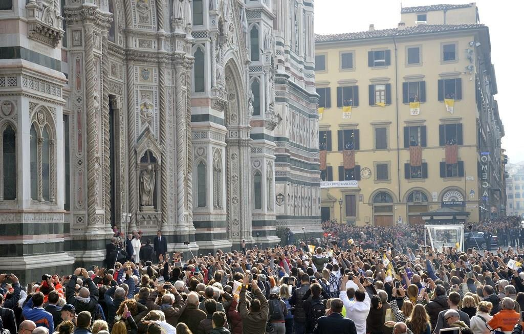 Itt vagyunk Firenzében, a szépség városában. Mennyi szépséget állítottak e városban a szeretet szolgálatába! Gondolok itt például az Ospedale degli Innocenti lelencházra és kórházra. A reneszánsz építészet egyik első remekét az elhagyott gyermekek és a kétségbeesett anyák szolgálatára emelték. Gyakran megtörtént, hogy az anyukák újszülöttükkel együtt egy félbevágott érmet is otthagytak, abban a reményben, hogy majd az érem másik felét bemutatva felismerhetik majd gyermeküket, ha szebb napok köszöntenek rájuk. Ez az, képzeljük csak el, hogy a mi szegényeinknek van egy fél érmük. A másik fele pedig nálunk van. Mert az anyaszentegyháznál van Olaszországban mindenki érmének a fele, és megismeri összes elhagyott, elnyomott, megfáradt gyermekét. És ez öröktől az egyik erényetek, mert jól tudjátok, hogy az Úr nemcsak néhány emberért ontotta ki vérét, nem is kevesekért, nem is sokakért, hanem mindenkiért.