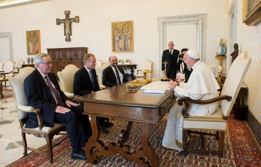 Robert Schuman – abban, amit sokan az első európai közösség megszületési aktusát látják – azt mondta: „Európát nem egy csapásra, nem is az egész egyszeri felépítésével teremtjük majd meg, hanem konkrét tettekkel, amelyek mindenekelőtt tényleges szolidaritást hoznak létre” [3]. Épp manapság, ebben a meggyötört és sérült világban, vissza kell térni ahhoz a tényleges szolidaritáshoz, ahhoz a konkrét nagylelkűséghez, amely a második világháborút követte, mert – folytatta Schuman – „a világbékét csak olyan teremtő erőfeszítésekkel lehet megmenteni, amelyek megfelelnek az azt fenyegető veszélyek nagyságának” [4]. Az alapítóatyáknak – a béke hírnökeinek és a jövő prófétáinak – terveit nem haladtuk meg: ma jobban, mint valaha arra inspirálnak, hogy hidakat építsünk és falakat ledöntsünk. Mintha határozottan arra szólítanának fel, hogy ne elégedjünk meg azzal, hogy kozmetikázással vagy körmönfont kompromisszumokkal kijavítunk egynémely szerződést, hanem bátran fektessünk le új, erős alapokat; ahogy Alcide De Gasperi kijelentette: „mindnyájan egyformán aggódva európai hazáink, Európa Hazánk közös javáért”, félelem nélkül kezdjünk bele újra egy olyan „építő munkába, amely türelmes és hosszú távú együttműködésünk minden erőfeszítésére igényt tart” [5].
