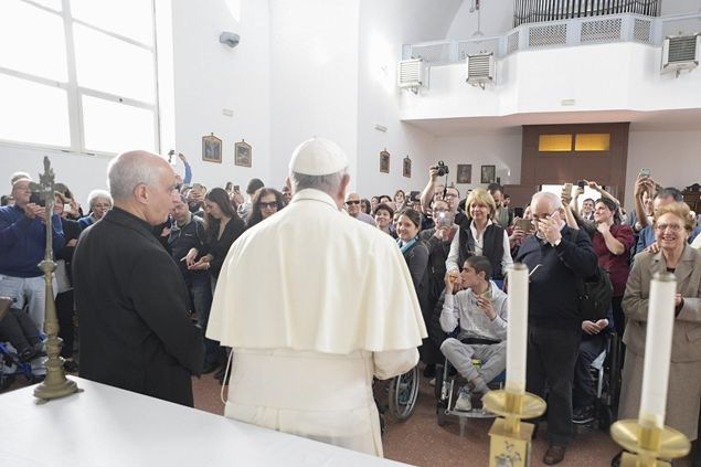 A pápa találkozott az intézet lakóival, több mint 30 időssel illetve felnőttel, valamint mindazokkal, akik csak napközben járnak rehabilitációra. Közöttük volt mintegy tíz gyermek. Valamennyien látássérültek: vagy születésüktől fogva vakok, vagy súlyos betegségek következtében veszítették el látásukat. Voltak köztük halmozott fogyatékossággal élők is. A pápát a Szent Alexius Központ igazgatója, Amedeo Piva fogadta.