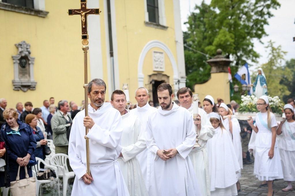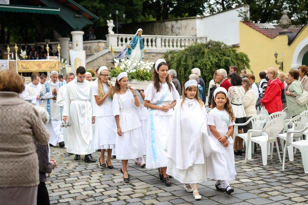 A felajánló ima befejeztével indult el a körmenet. Elöl a templom keresztjét hordozók, aztán a máriás lányok – Szűz Mária szobrával, majd a papság, a főcelebráns érsek és a baldachin alatt az Oltáriszentség. A körmenetben százak és százak vonultak énekelve, imádkozva, hogy a szabadtéri oltárhoz visszatérve, a máriás énekeket követően elénekeljék a pápai és a magyar himnuszt.