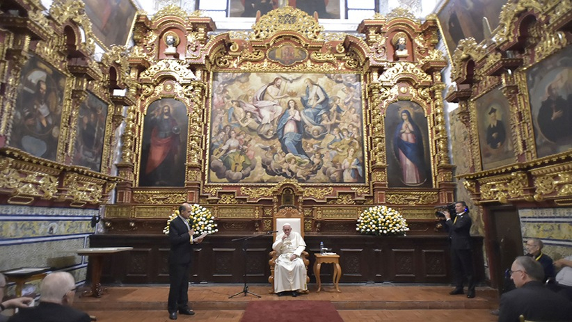Ferenc pápát a tartományfőnök, Juan Carlos Morante és a helyi elöljáró, José Enrique Rodríguez fogadta a penitenciária kápolnájánál. A bal templomhajón végigsétálva a pápa a sekrestyébe lépett, ahol mintegy száz jezsuita várta. P. Morante köszönetet mondott Ferencnek látogatásáért, és beszélt a társaság elkötelezett evangelizáló és oktató munkájáról az őshonos népek között, megemlítette többek között Alonso de Barzana (1528–1598), Francisco del Castillo (1615–1673) és Antonio Ruiz de Montoya (1585–1652) atyát. Beszélt a II. vatikáni zsinat utáni új perspektívákról és az új kihívásokról: a szegényekkel való foglalkozás elsődlegessége, a lelkigyakorlat, a világiakkal való együttműködés, és az új apostoli kihívások, melyek új apostoli megkülönböztetést igényelnek. Azután a pápa vette át a szót.