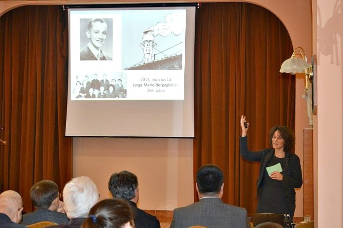 Csiszár Klára Ferenc pápa személyes életstílusáról, politikához való viszonyáról, egyházreformjáról és ellenlábasairól is szót ejtett. Az előadást kísérő vetített képek között megjelentek karikatúrák is, amelyek egyaránt jól mutatják a szimpatizánsok és a pápa egyenességén megrökönyödők viszonyulását.
