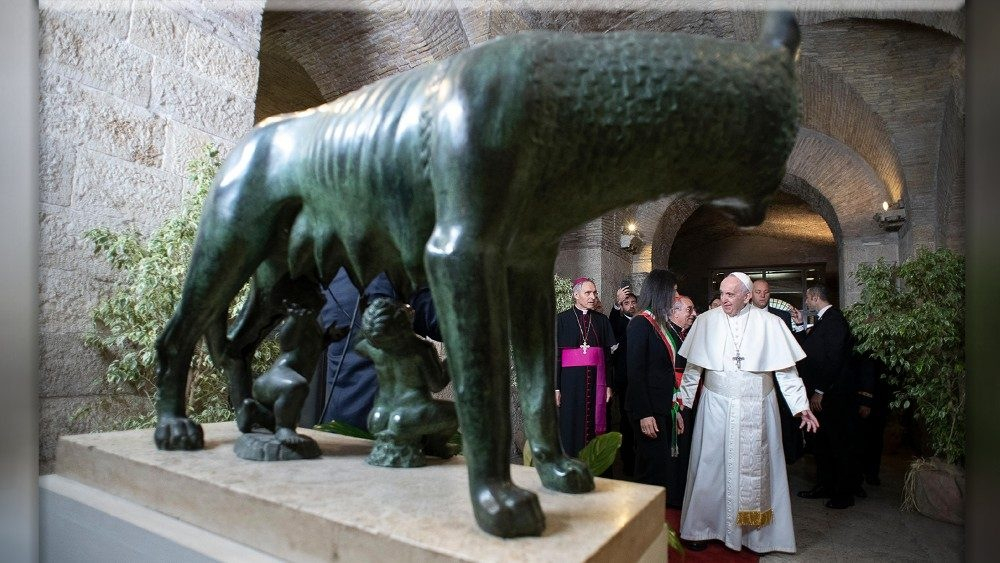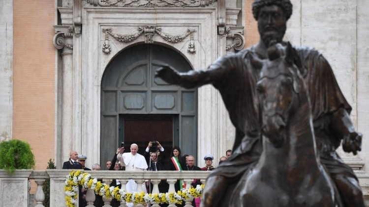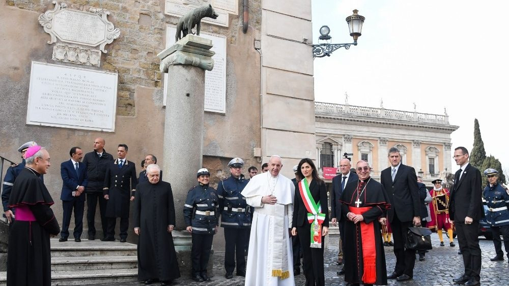 Régóta szerettem volna eljönni a Capitolium-dombra, hogy találkozzam önökkel, és személyesen mondjak köszönetet azért az együttműködő segítségért, amelyet a városi hatóságok nyújtottak a Szentszéknek az irgalmasság rendkívüli szentéve alkalmával, valamint a többi egyházi esemény lebonyolításakor. Ezeknek ugyanis, rendezett és sikeres megtartásukhoz, szükségük van az önök, a város közigazgatásának segítőkészségére és szakszerű munkájára. Ez város ugyanis több évezredes történelemnek a tanúja, és a kereszténység befogadásával a századok során a katolicizmus központjává vált.