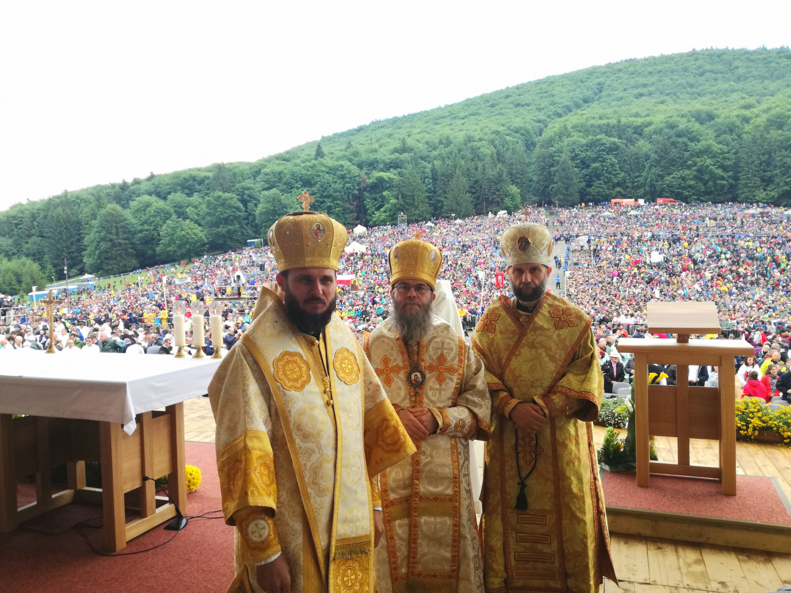 Kocsis Fülöp érsek-metropolita, Orosz Atanáz miskolci püspök és Szocska Ábel nyíregyházi püspök a csíksomlyói pápalátogatáson
