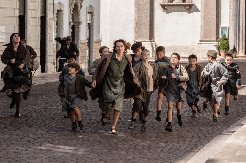 Jelenet a filmből: Chiara az óvóhelyre fut tanítványaival a bombázás kezdetén