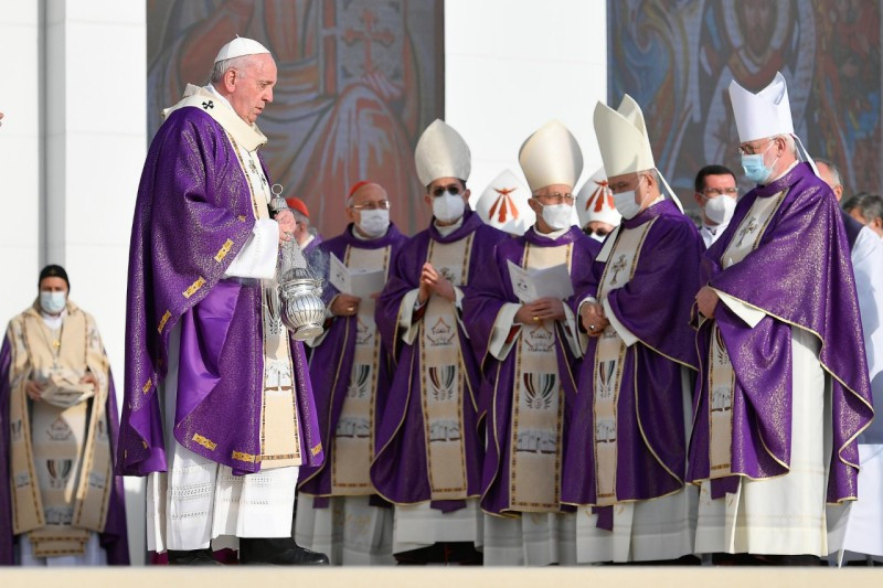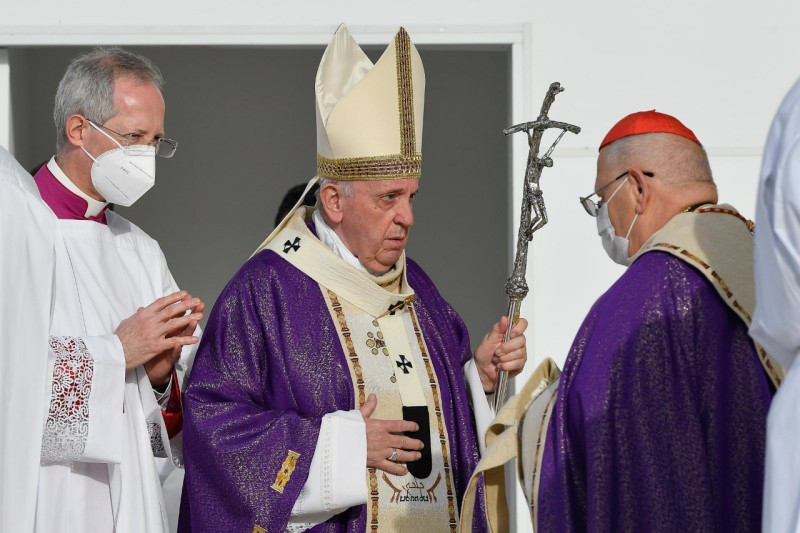 „Bontsátok le ezt a templomot, és harmadnapra felépítem” (Jn 2,19). Testének templomáról, tehát az ő Egyházáról is beszélt. Az Úr megígéri nekünk, hogy feltámadásának erejével fel tud támasztani bennünket és közösségünket az igazságtalanság, a megosztottság és a gyűlölet okozta romok alól. Ezt az ígéretet ünnepeljük ebben az eucharisztiában. A hit szemével felismerjük a keresztre feszített és feltámadott Úr jelenlétét körünkben, megtanuljuk befogadni az ő felszabadító bölcsességét, megtanulunk megpihenni sebeiben, és gyógyulást és erőt találni világunkba érkező országának szolgálatára. Sebei által gyógyultunk meg (vö. 1Pét 2,24); kedves fivéreim és nővéreim, sebeiben találjuk meg irgalmas szeretetének balzsamát; mert ő, az emberiség irgalmas szamaritánusa minden sebet be akar kenni, minden fájdalmas emléket be akar gyógyítani, és a béke és testvériség jövőjét akarja inspirálni ezen a földön.
