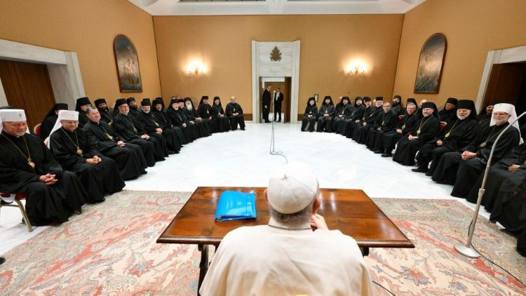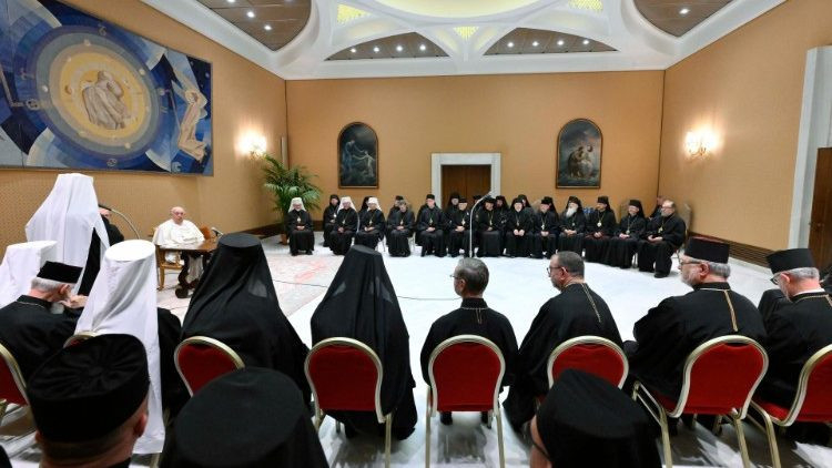 A Szentatya szeptember 6-án, szerdán délelőtt az általános kihallgatást megelőzően a VI. Pál teremben fogadta az ukrán görögkatolikus egyház szinódusának püspökeit. A közel kétórás találkozó elején Szvjatoszlav Sevcsuk ukrán nagyérsek mondott üdvözlő szavakat, felidézte a hazájában uralkodó fájdalmas helyzetet, a halottak, sebesültek és megkínzott emberek növekvő számát, és megköszönte a pápának a sokféleképpen és számos alkalommal tanúsított szeretetét. Többen felszólaltak, mindannyian beszámoltak a szenvedésekről, amelyeket az ukrán nép különböző helyeken és különböző módokon megél.