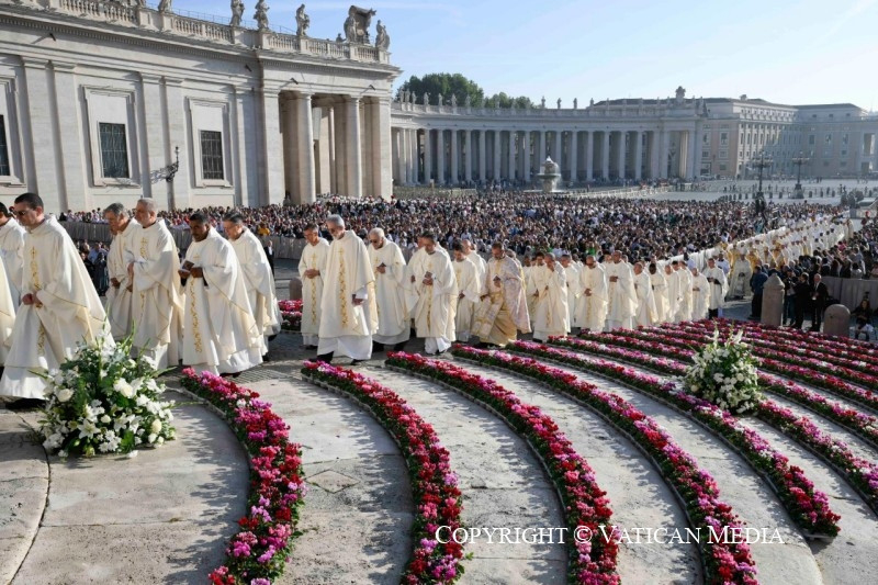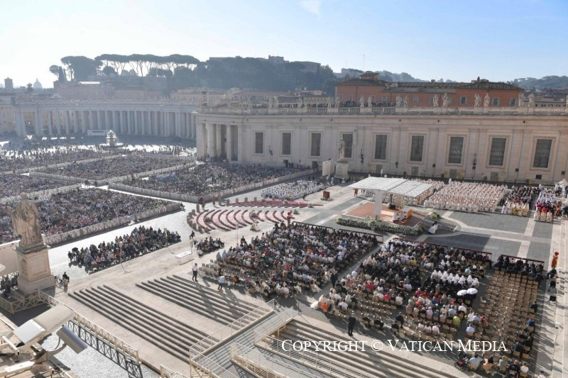 Október 4-én délelőtt a Szentatya az újonnan kinevezett bíborosokkal és a bíborosi testülettel mutatott be szentmisét a püspöki szinódus rendes közgyűlésének megnyitásaként a Szent Péter téren. Homíliájában azt mondta, hogy Jézusra összpontosító Egyházra van szükség, mely „vidám lélekkel szemléli Isten cselekvését és vizsgálja a jelent”, nem merev, nem langyos, nem önmagába zárkózó, hanem amely „irgalommal tekint az emberiségre”, „vendégszerető”, „összetartó és testvéries”. Ferenc pápa teljes homíliájának fordítását közreadjuk.