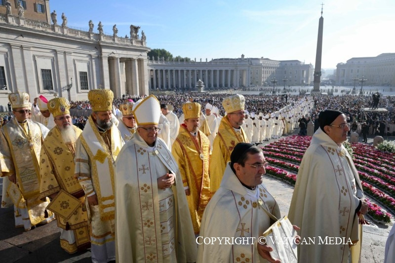Jézus áldó tekintete arra hív bennünket, hogy olyan Egyház legyünk, amely nem megosztó és viszályt szító szellemben néz szembe a mai kihívásokkal és problémákkal, hanem épp ellenkezőleg, szemét Isten felé emeli, aki közösség, ámulattal és alázatosan áldja és imádja őt, elismerve őt egyetlen Urának. Hozzá tartozunk, és – ne feledjük – csak azért létezünk, hogy őt elvigyük a világnak. Ahogy Pál apostol mondta, nem dicsekedhetünk másban, csak „a mi Urunk Jézus Krisztus keresztjében” (Gal 6,14). Ez elég, ő elég nekünk. Nem földi dicsőségre áhítozunk, nem a világ szemében akarunk szépek lenni, hanem az evangélium vigasztalásával akarunk széppé válni, hogy jobban és mindenki előtt tanúságot tegyünk Isten végtelen szeretetéről. XVI. Benedek épp egy szinódusi közgyűléshez szólva mondta: „A kérdés számunkra a következő: Isten szólt, valóban megtörte a nagy csendet, megmutatta magát, de hogyan tudjuk elérni, hogy ez a valóság elérje a ma emberét, hogy üdvösséggé váljon?” (Elmélkedés a püspöki szinódus XIII. rendes közgyűlésének első plenáris ülésén, 2012. október 8.). Ez az alapvető kérdés. És ez a szinódus elsődleges feladata: hogy szemünket újra Istenre szegezzük, s ezáltal olyan Egyház legyünk, amely irgalommal tekint az emberiségre.