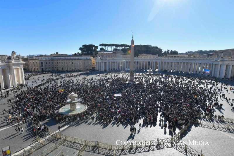 Ezekben a napokban különösen a keresztények egységéért imádkozzunk, és fáradhatatlanul imádkozzunk az Úrhoz a békéért Ukrajnában, Izraelben és Palesztinában, és a világ sok más táján: a béke hiányától mindig a leggyengébbek szenvednek. A kisgyermekekre gondolok, a sok sérült és megölt gyermekre, a szeretettől, az álmoktól és jövőtől megfosztott gyermekekre. Érezzünk felelősséget azért, hogy imádkozzunk a békéért és építsük a békét értük!