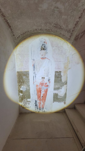 „A lépcsőház földszinti részén még sokkal szerényebb, egyszerű faragott kőből rakott falak láthatók. Nagy valószínűséggel itt igyekezett felfelé a sötétben a vendég az imbolygó gyertyafényben. A fordulóhoz érve aztán megdöbbenhetett a látogató, hiszen a semmiből egy marcona katona állta az útját. Az élethűen ábrázolt alak hófehér zubbonyán ragyognak az aranygombok, jobb kezében ijesztő, szuronyos puskát tart. Aki kétes szándékkal érkezett, az innen bizonyára visszafordult” – magyarázta Nagy Veronika, kiegészítve azzal, hogy az egyenruha díszítése alapján a kutatók úgy látják, a festmény egy osztrák császári katonát ábrázol.