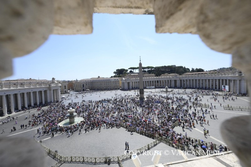 És köszöntelek mindannyiatokat, rómaiak, Olaszországból és sok más országból érkezett zarándokok. Külön is köszöntöm a bergamói kisszeminárium növendékeinek csoportját, akik gyalog jöttek Assisiből, többnapos zarándoklat keretében. Elfáradtatok? Nem? Jól van! Ügyesek vagytok!
