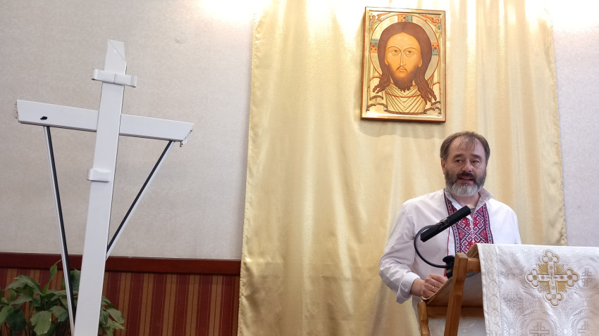 mindannyian együtt ülünk le imádságra, Jézus tekint ránk az ikonról, amely mellett a fehér kereszt a lerombolt irpinyi iskola ablakkeretéből készült.