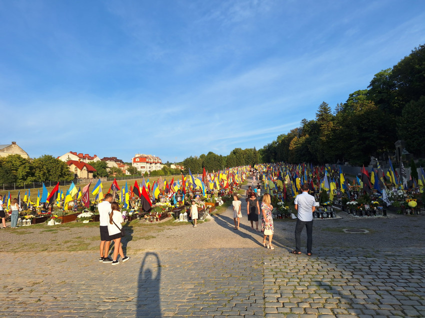 A katonai temető látványa olyan megrendítő, hogy szinte leírhatatlan: közel félszáz sír, friss virágokkal, zászlókkal, a fronton elesett férfiak arcképeivel. Katonai parcella, de ezek a fiúk, férfiak úgy néznek ránk a fotókról, mint a testvéreink, szüleink, gyerekeink... Közülünk valók, akik a hazájuk védelmében harcba szálltak.