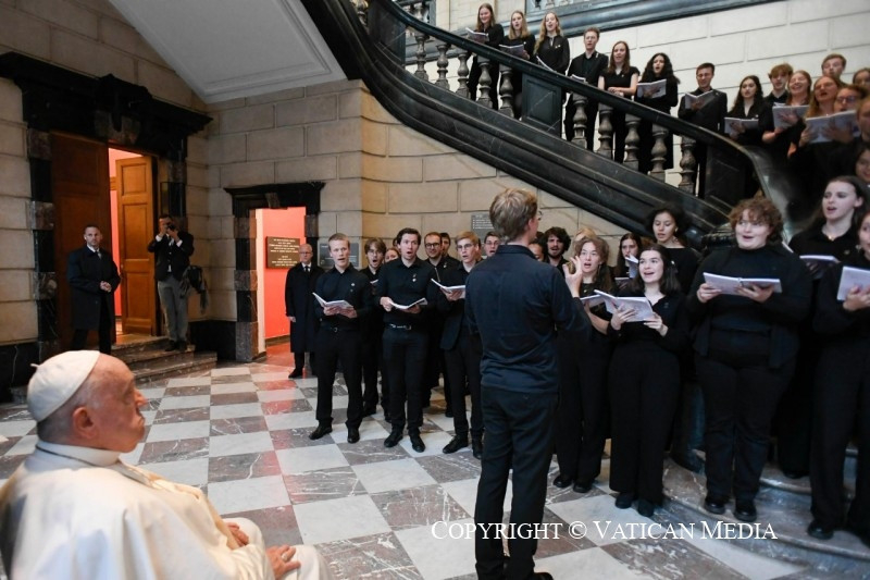 Erre van szükségünk: olyan kultúrára, amely kitágítja a határokat, amely nem „szektás” – és ti nem vagytok szektásak, köszönöm! –, nem helyezi magát mások fölé, hanem ellenkezőleg, elvegyül a világ tésztájában, jó kovászt vive bele, mely az emberiség javához járul hozzá. Ez a feladat, ez a „nagyobb remény” van rátok bízva!