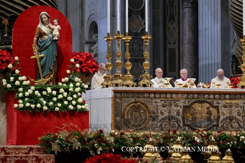 Kedves testvéreim, e főünnepen, az új év kezdetén, a remény jubileumának lezárásához közeledve hittel járuljunk a betlehemhez, mint a „fegyvertelen és lefegyverző” béke voltaképpeni helyéhez, az áldás helyszínéhez, ahol emlékezetünkbe idézzük mindazokat a csodákat, amelyeket az Úr az üdvtörténetben és saját életünkben végbevitt; majd induljunk útnak újra, a barlang alázatos tanúihoz hasonlóan,
