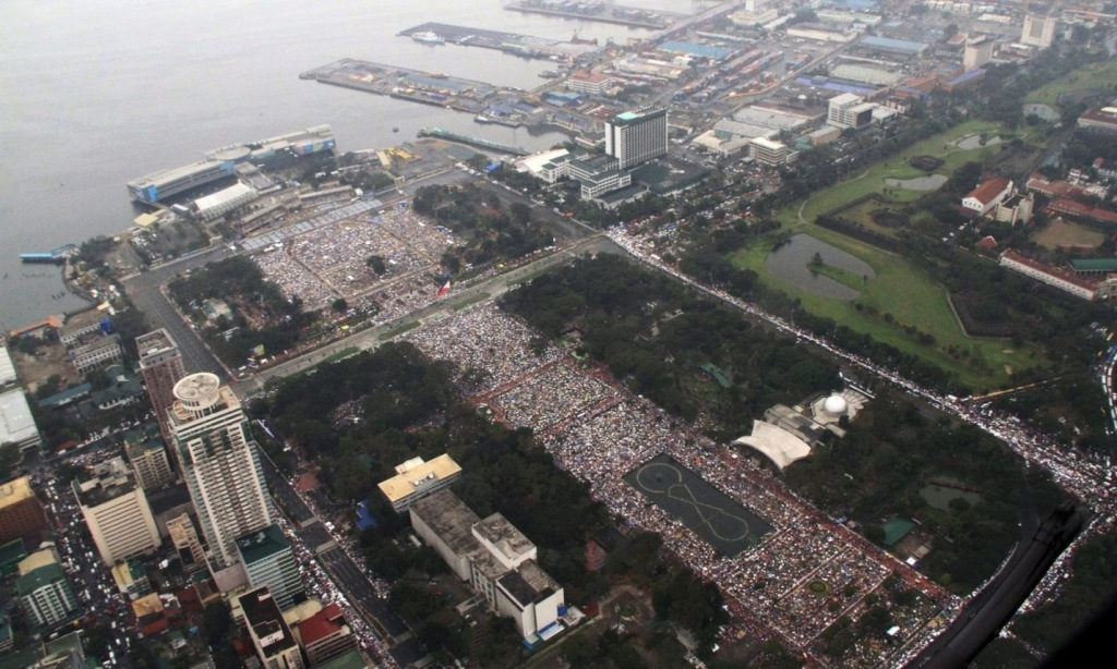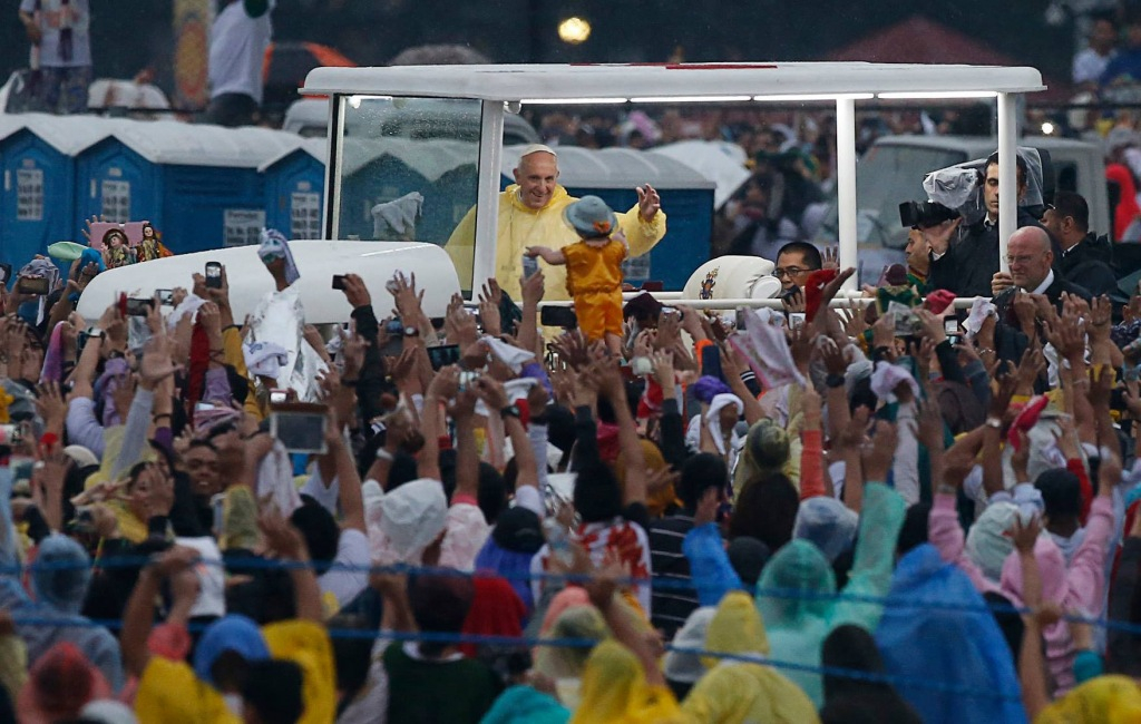 Az egyházfő a tömeg lelkes éljenzése kíséretében vonult be pápamobilján a manilai Rizal parkba, ugyanolyan olcsó sárga átlátszó műanyag esőköpenyt viselve a trópusi esőben, mint amilyet előző nap a 2013-as Jolanda tájfun sújtotta Taclobanban bemutatott mise idején osztogattak a tömegnek. A szervezők vasárnapra mintegy hatmilliós, rekordszámú hallgatóságot vártak a 60 hektáros parkba és a a környező utcákba (II. János Pál pápa 1995-ös vizitje idején ötmillióan voltak.