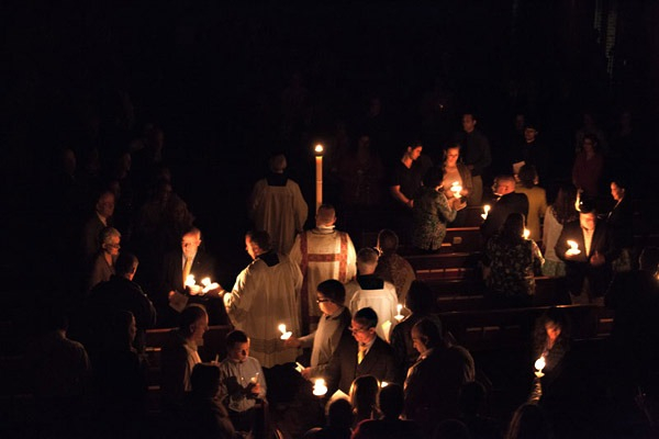 A szertartás a tűzszenteléssel kezdődik: egyedül a parázsló szén világít, s az arról vett tűzzel a pap meggyújtja a húsvéti gyertyát, miközben azt imádkozza, hogy Jézus Krisztus tegnap és ma, ő a Kezdet és a Vég, ő az Alfa és az Ómega, övé az idő, és övé az örökkévalóság, övé a dicsőség és a hatalom, mindörökkön örökké. A húsvéti gyertya fénye maga is a feltámadt Jézus Krisztust jelzi, aki új reményt ad az embernek.