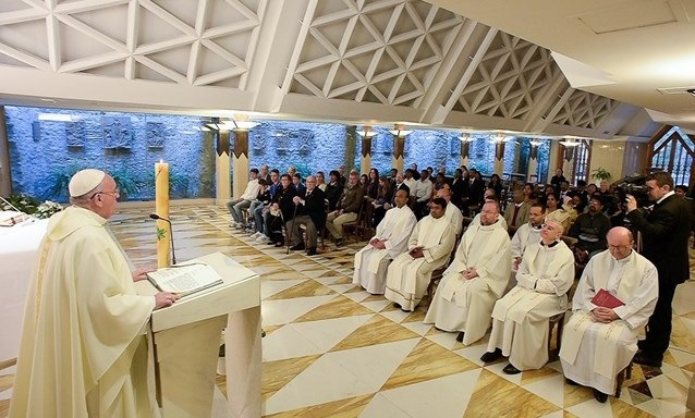 Mindig is fennállt a kísértés, hogy a vallásos rácsodálkozás, amelyet Jézus ad nekünk a vele való találkozáskor, átalakuljon az ebből való profitszerzéssé. Ez volt az ördög javaslata is, amikor Jézust megkísértette. Az első kísértés a kenyérhez, a másik a feltűnősködéshez kapcsolódott, mondván: „Csináljunk egy látványos előadást, így aztán minden ember hinni fog benned.” A harmadik kísértés pedig az aposztázia, a hitehagyás, vagyis a bálványok imádása. Ez a keresztények mindennapi kísértése, mindannyiunké, akik az egyházban vannak: nem a Lélek hatalmának, erejének kísértése ez, hanem a világi hatalomé. Így aztán belekerül az ember a vallási langyosságba, amely a világiassághoz vezet. Ha ez a langyosság egyre csak növekszik, az azt a viselkedést eredményezi, amelyet Jézus álszentségnek hív – figyelmeztetett Ferenc pápa.