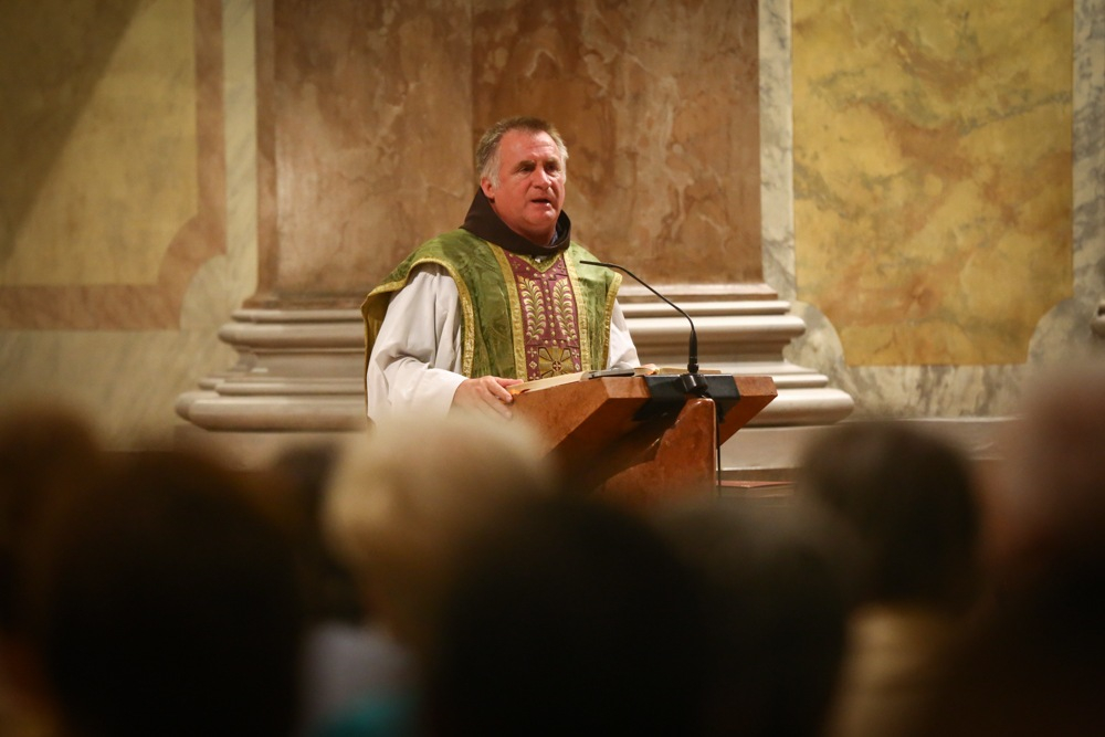 A napi szentírási idézetekből kiindulva Böjte Csaba rámutatott: Illés próféta idején és Jézus korában ugyanúgy voltak problémák, mint manapság. Illés próféta, amikor azt hitte, innen már nem fog felkelni, elcsüggedt, akkor Isten erőt adott neki, és talpra állította. Jézus Krisztus pedig a problémákkal küszködő embereket nem elítéli, hanem táplálja őket: életét adta értünk, mert azt akarta, hogy életünk legyen, és bőségben legyen. Most is van a Kárpát-medencében elég probléma, gondoljunk akár a menekültek kérdésére vagy a politikai feszültségekre, ezeket nem szabad a szőnyeg alá söpörni, letagadni – figyelmeztetett a ferences szerzetes, hozzátéve: népünk Isten erejével sokkal erősebb, mint a gond, a baj.
