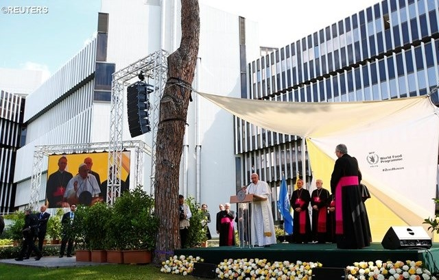 „A katolikus egyház ebben az összefüggésben kínálja fel szolgálatát és küldetését, és azt óhajtja, hogy a többi kezdeményezéssel összhangban küzdjön az emberi méltóság megőrzéséért. »Éhes voltam, és enni adtatok, szomjas voltam, és inni adtatok« (Mt 25,31–46). Ezekben a szavakban találjuk meg a kereszténység legfőbb szabályát, mely az egyes vallási felekezeteken túl aranyszabály lehetne az összes nemzet számára is. Egy nemzet saját jövőjét annyiban építi, amennyiben magára vállalja éhes és szomjas embertestvéreinek gondját” – zárta beszédét Ferenc pápa az ENSZ Világélelmezési Programja bizottságának éves közgyűlésén.
