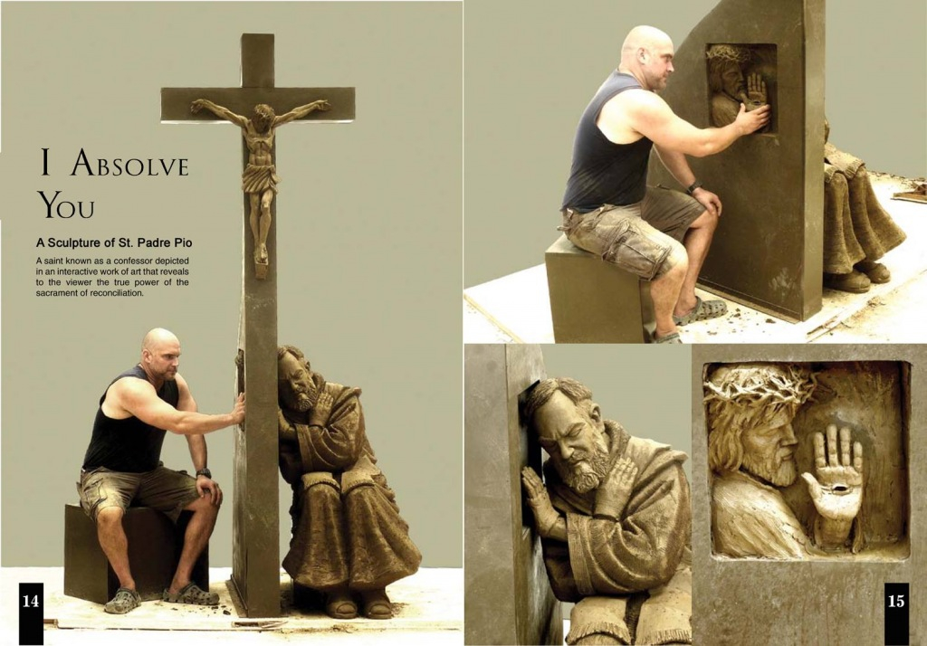 A világhírű művész, Timothy P. Schmalz, aki a Hajléktalan Jézus című szobrot is készítette, Isten irgalmasságát szerette volna megjeleníteni Pio atya bronzalakja révén. Az alkotás közben sokat gondolt saját bűneire, és a sok rosszra, amit mások tettek. „Amikor megvizsgáltam, kiről is készítek szobrot – Pietrelcinai Szent Pio, a bűnbánók, gyónók védőszentje –, arra gondoltam, miért is ne vihetném bele ezeket a kínzó gondolatokat.” Timothy P. Schmalz misztikus élménynek nevezte az alkotás folyamatát. „Azt mondhatom, én voltam az első, aki élvezhette a szobor jótékony hatását” – vallotta. A Feloldozlak téged címet adta a szobornak, és miközben dolgozott rajta, megvalósította azt, amit Ferenc pápa mondott a Pio atya-imaközösségek képviselőinek 2014 februárjában, amikor találkozott velük a Vatikánban: Pio atya segítségével fedezzék fel „Isten megbocsátásának és irgalmának szépségét” mindennap, és szívleljék meg a szent szavait, hogy az ima „olyan kulcs, ami megnyitja Isten szívét”.