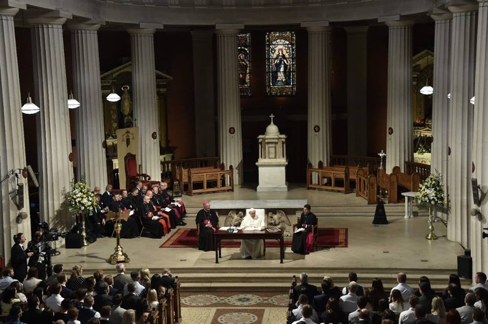 Augusztus 25-én, szombaton délután Ferenc pápa a Családok IX. Világtalálkozója alkalmából házaspárokkal találkozott és beszélgetett Dublinban, a Szűz Mária-székesegyházban.